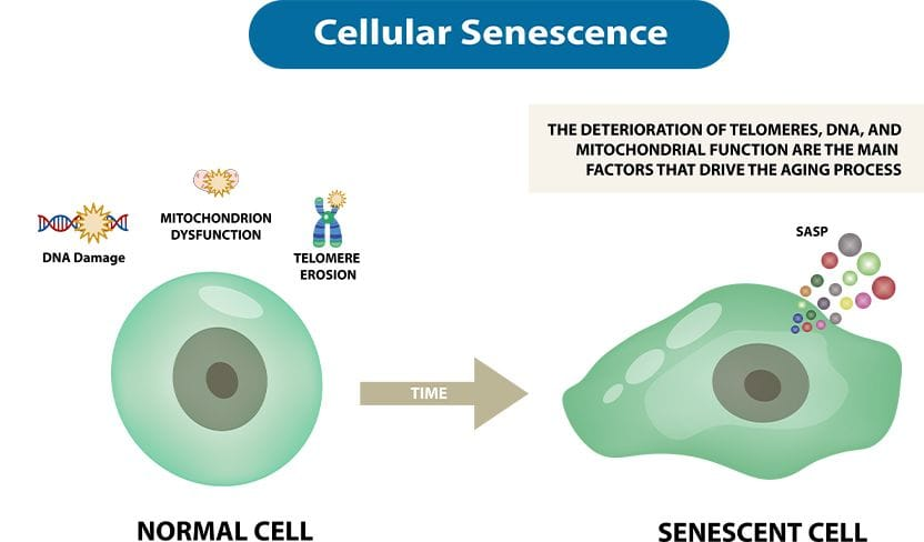 Cellular senescence is a fundamental driver of aging and age-related diseases but boosting NAD+ levels offers a promising avenue to counteract these effects. By enhancing NAD+ availability, we can improve DNA repair, activate sirtuins, optimize mitochondrial function, and reduce inflammation, collectively reversing cellular senescence and promoting longevity.
