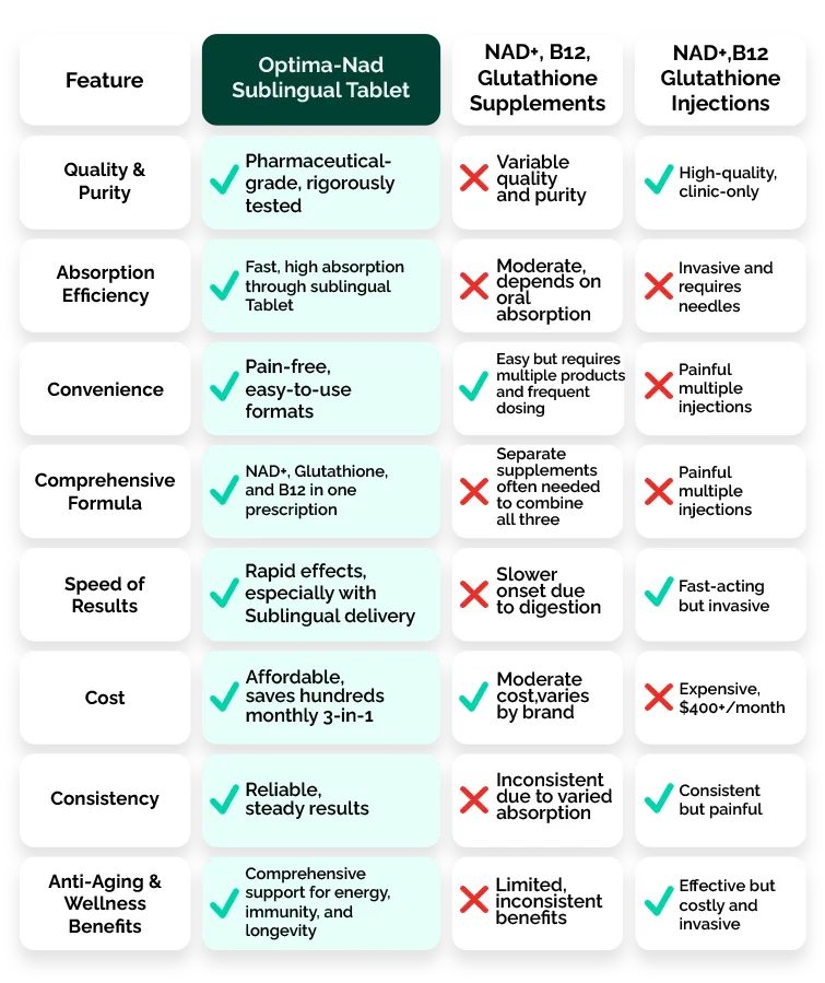 Available as a Sublingual Tablet , Optima-Nad+ delivers faster absorption and greater convenience without the need for painful injections or juggling multiple products.