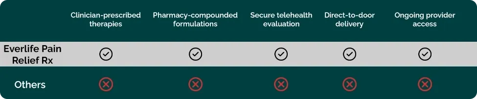 Disclosure: Everlife Pain Relief Rx is a prescription-only compounded medication prepared by a licensed U.S. compounding pharmacy pursuant to a provider prescription. Compounded medications are not FDA-approved. Treatment requires medical evaluation and provider approval. This formulation contains Diclofenac (an NSAID) which may carry risks including gastrointestinal bleeding, cardiovascular events, kidney complications, or allergic reactions in some individuals. Use only as directed. Individual results may vary.