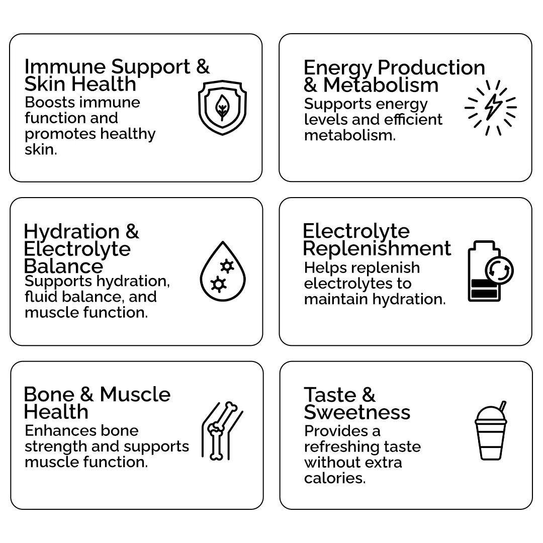 throughout the day. Packed with essential electrolytes, minerals, andvitamins, it replenisheslost fluids, restores key nutrients, and supportsoptimal hydration.