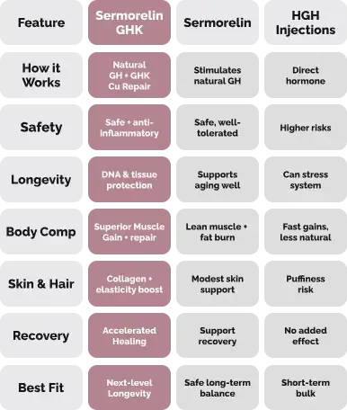 Amplify Muscle Growth & Recovery – Sermorelin drives GH release while GHK-Cu accelerates cellular repair.